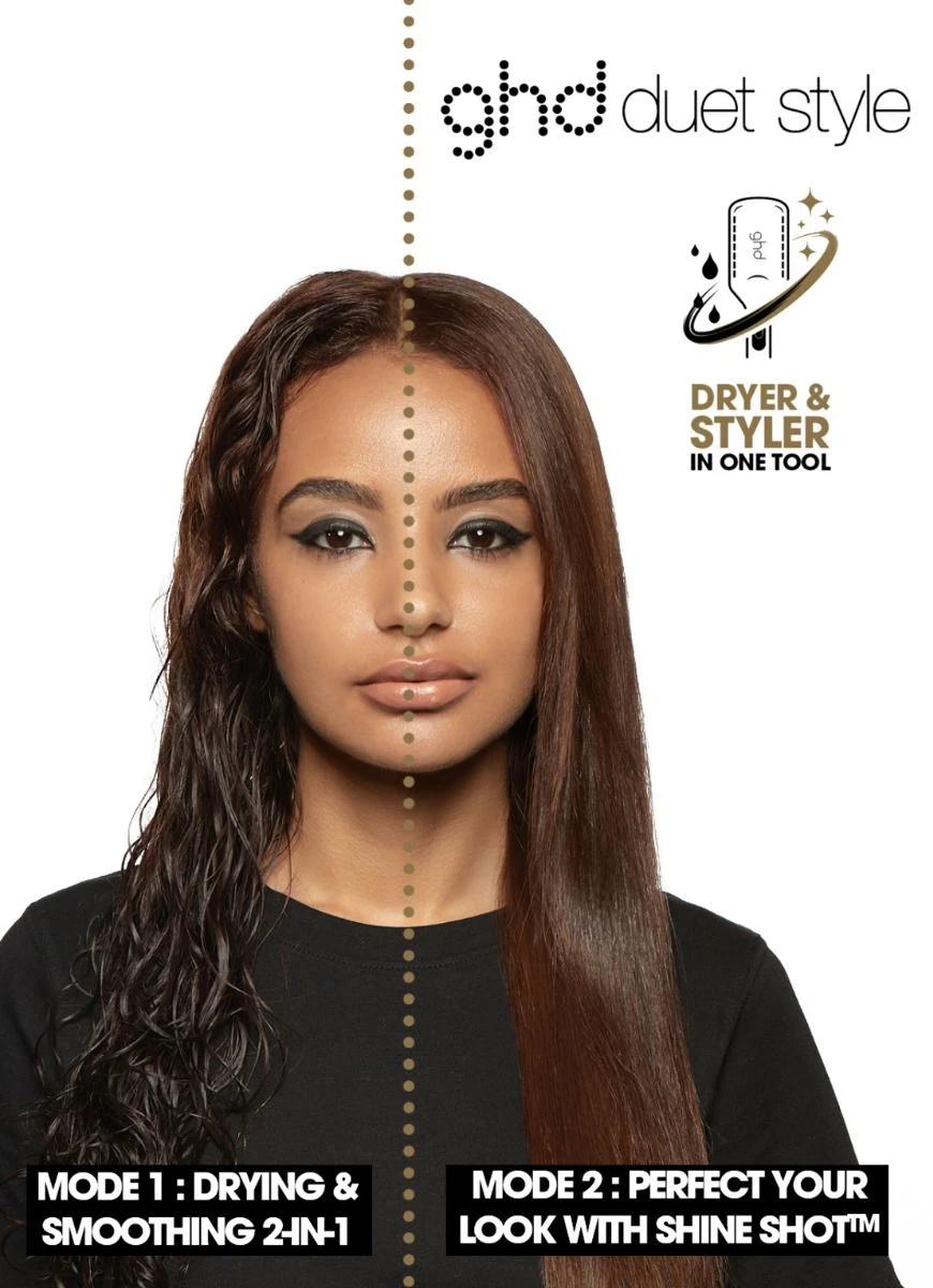 Geef het haar de perfecte finishing touch met de exclusieve Shine Shot™ modus. Deze functie is alleen geschikt voor gebruik op droog haar en zorgt voor prachtige glad haar met een pluisvrije finish. De Shine Shot™ modus transformeert de Duet Style in een ghd Styler. Zo kun je het haar stylen met een optimale stylingtemperatuur van 185°C, zonder het gebruik van lucht. Voor gestyled haar met een mooie glans!