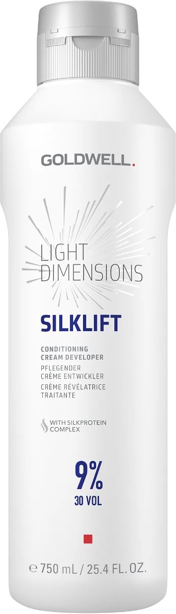 Goldwell Light Dimensions Silklift Conditioning Cream Developer 9% 750ml is een sterkte ontwikkellotion met het Silk Protein Complex en Intra Lipid TM. Deze technologieën zorgen tijdens het ontkleuringsproces voor een optimale verzorging van het haar. De conditioning cream geeft het haar een mooie glans en meer body. Door de crème-achtige samenstelling bereik je een mooi en egaal kleurresultaat.