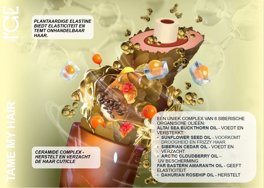 De olie bevat daarnaast een uniek complex van 6 Siberische organische oliën, elk met hun eigen specifieke voordelen. Altai sea buckthorn oil voedt en versterkt het haar, terwijl de sunflower seed oil uitdroging en kroezen voorkomt. Siberian cedar oil zorgt voor voeding en zachtheid, terwijl Arctic cloudberry oil het haar beschermt tegen schadelijke UV-stralen. Verder geeft de far eastern amaranth oil elasticiteit aan het haar en temt het onhandelbaarheid. Ten slotte herstelt de Dahurian rosehip oil het haar, waardoor het er gezonder en glanzender uitziet.