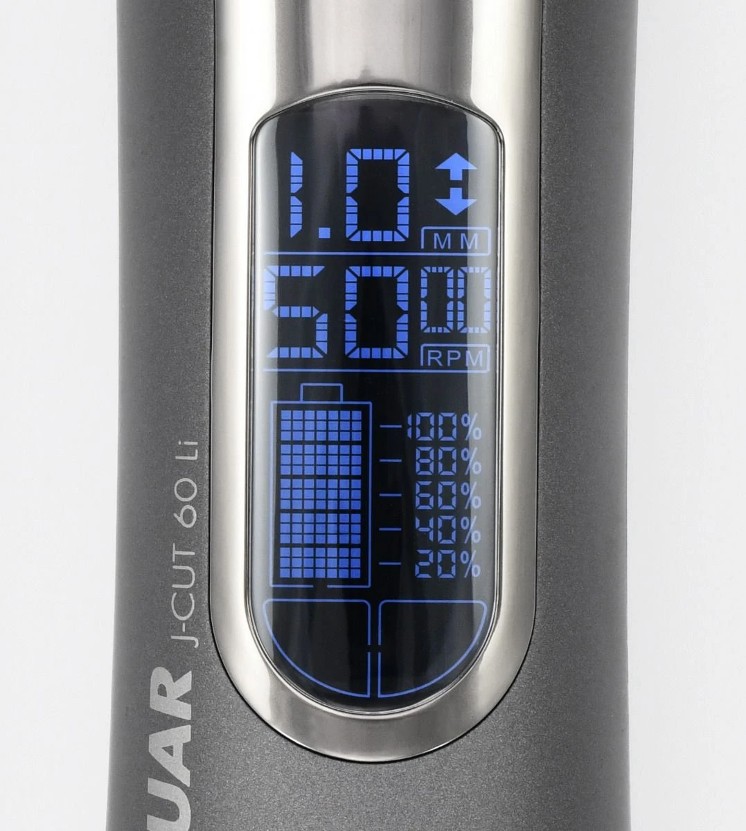 De Jaguar Trimmer J-Cut 60 Li heeft een duurzame lithium-ionen-accu met een extreem lange gebruiksduur van 4 uur. De trimmer beschikt over een LCD-scherm met een speciale indicator waarop de accustatus van de trimmer gemakkelijk is af te lezen. Ook kun je hierop aflezen of de olie bijgevuld moet worden.