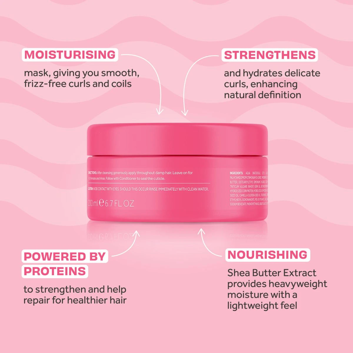 Doordat krullend haar droger en fragieler kan zijn dan andere haartypes, focust dit masker zich op voedende en hydraterende ingrediënten. Dankzij de ingrediënten shea butter, cacao en organische kokosnootolie worden de natuurlijke golven in het haar verbeterd en gedefinieerd. Krullend haar is dol op deze ingrediënten, want het haar zal er weer versterkt en gezond uit gaan zien.